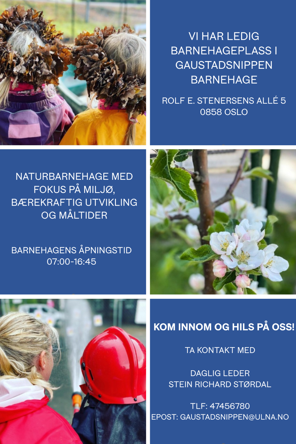 Trenger du barnehageplass i en aktiv og trygg barnehage? Ta kontakt med barnehagen for mer informasjon.